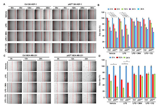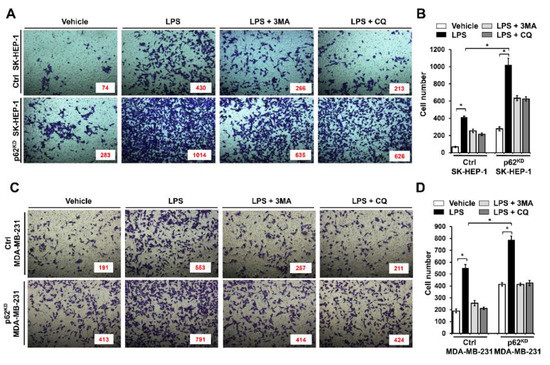 Having shown that p62 negatively regulated autophagy activation, we asked whether the inhibitory effect was functionally associated with cancer cell migration and invasion. To do that, migration and invasion assays were performed in p62KD SK-HEP-1 and p62KD MDA-MB-231 cells. Ctrl SK-HEP-1 and p62KD SK-HEP-1 were treated with vehicle, LPS, LPS plus a 3-methyladenine (3-MA) autophagy inhibitor, and LPS plus a CQ autophagy inhibitor, and then wound healing assay was performed. Based on LPS treatment, cancer cell migratory behavior was significantly higher in p62KD SK-HEP-1 than the Ctrl SK-HEP-1 cells in a time dependent manner (Figure 4A,B, Ctrl versus p62KD SK-HEP-1 in LPS treatment). These results were consistently observed in Ctrl and p62KD MDA-MB-231 cells (Figure 4C,D, Ctrl versus p62KD MDA-MB 231 in LPS treatment). As expected, marked attenuations could be seen in co-treatments with 3-MA or CQ (Figure 4A,B, Ctrl versus p62KD SK-HEP-1 in LPS plus 3-MA or CQ: Figure 4C,D, Ctrl versus p62KD MDA-MB-231 in LPS plus 3-MA or CQ). We next assessed invasiveness following TLR4 stimulation. Ctrl SK-HEP-1 and p62KD SK-HEP-1 were treated with vehicle, LPS, LPS plus 3-MA, and LPS plus CQ, and then transwell migration assay was performed. Similar to the wound healing assay, progressive invasiveness was significantly higher in p62KD SK-HEP-1 than in Ctrl SK-HEP-1 in the presence of LPS (Figure 5A,B, Ctrl versus p62KD SK-HEP-1 in LPS treatment). Consistent results were observed in Ctrl and p62KD MDA-MB-231 cells (Figure 5C,D, Ctrl versus p62KD MDA-MB-231 in LPS treatment).