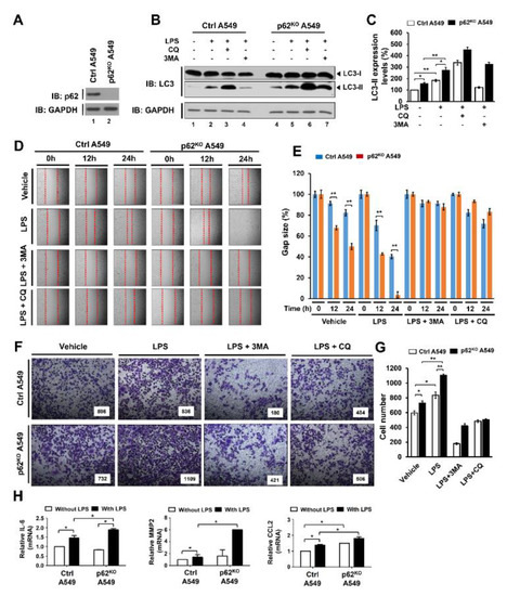 p62KO A549 cells exhibited increased autophagy activation, migration, and invasion in response to TLR4 stimulation. (A) p62KO A549 cells were generated, and the knockout efficacy of p62 was confirmed with anti-p62 antibody. (B,C) Ctrl and p62KO A549 cells were treated with or without vehicle, CQ (10 μM), or 3-MA (5 mM), or, in the presence or absence of LPS (10 μg/mL), for 6 h. Whole cell lysates were immunoblotted with anti-LC3A/B antibody and anti-GAPDH antibody as a loading control (B). The LC3II levels were analyzed with Image J program (right, histogram) (C). Data shown are averages from a minimum of 3 independent experiments (± SEM). * p < 0.05 and ** p < 0.01. (D,E) Ctrl and p62KO A549 cells were seeded into 12-well cell culture plates. Confluent monolayers were scraped with a sterile yellow Gilson-pipette tip to make wounds, and then incubated with vehicle (DMSO, <0.2% in culture medium), LPS (10 μg/mL), 3-MA (5 mM) plus LPS (10 μg/mL), and CQ (10 μM) plus LPS (10 μg/mL) for different time periods. A representative experiment is represented (D). The residual gap between the migrating cells from the opposing wound edge was represented as a percentage of the initial scraped area (± SEM, n = 3) (E). ** p < 0.01. (F,G) Ctrl and p62KO A549 cells were suspended in RPMI medium including vehicle, LPS (10 μg/mL), 3-MA (5 mM) plus LPS (10 μg/mL), and CQ (10 μM) plus LPS (10 μg/mL), and placed to the top chambers of 24-transwell plates. After an overnight incubation, cells were fixed and stained with crystal violet (F). Number of migrating cell were counted, and results are presented as mean ± SEM of 3 independent experiments (G). * p < 0.05 and ** p < 0.01. (H) Control (Ctrl) and p62KO A549 cells were treated with or without 10 μg/mL LPS for 6 h. Total RNA was extracted, cDNA was obtained, as described in materials and methods, and RT-qPCR analysis performed with specific primers, such as hIL-6, hMMP2, and hCCL2. * p < 0.05.