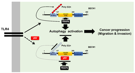In this study, we demonstrate that p62, which is a known negative regulator for the activation of autophagy by TLR4 signaling, inhibits the ubiquitination of BECN1 mediated by TRAF6. We demonstrate this occurs through an interruption to the molecular association between TRAF6 and BECN1 and, thereby, involves cancer cell migration and invasion, activities that are facilitated by autophagy, as depicted in Figure 7. Through the biochemical studies, we found that p62 competitively interacted with the coiled-coil domain of BECN1 affecting binding to TRAF6, and that induced an attenuation of BECN1 ubiquitination. Levels of LC3-II revealed increased autophagy induction in the presence of TLR4 stimulation by p62KD THP-1 and p62KD cancer cells. More importantly, these p62-deficient cancer cells, including p62KO A549 cells, showed enhanced migration and invasion in response to TLR4 stimulation. Taken together, these results suggest that p62 is negatively implicated in the activation of autophagy by TLR4 signaling, thereby demonstrating an involvement in cancer cell invasiveness facilitated by autophagy induction.