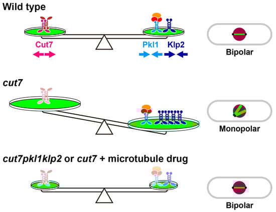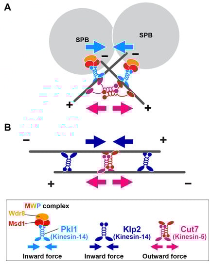 - Yukawa, M.; Yamada, Y.; Yamauchi, T.; Toda, T. Two spatially distinct kinesin-14 proteins, Pkl1 and Klp2, generate collaborative inward forces against kinesin-5 Cut7 in S. pombe. J. Cell Sci. 2018, 131, jcs.210740. [Google Scholar] [CrossRef] [PubMed]