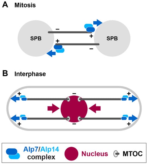 - Liu, W.; Zheng, F.; Wang, Y.; Fu, C. Alp7-Mto1 and Alp14 synergize to promote interphase microtubule regrowth from the nuclear envelope. J. Mol. Cell Biol. 2019, 11, 944–955. [Google Scholar] [CrossRef]