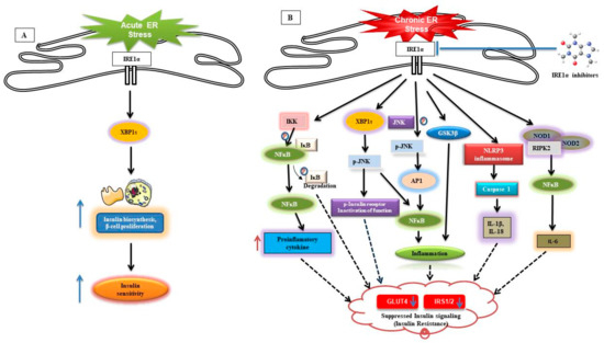One of the mechanisms which related to different complications is ER stress-mediated UPR activation. Among the UPR molecules, IRE1α contributes considerably to the progression of these diseases. In both genetic and diet-induced models of obesity, IRE1α is prominently activated [220]. The IRE1α/XBP1 pathway contributes significantly in lipogenesis through the transcriptional induction of lysogenic genes. Xbp1+/− mice exhibit increased ER stress coupled with impaired glucose and insulin tolerance in the high fat diet (HFD)-induced obesity [221], but in pathological manifestations, activated IRE1α modulates many downstream molecules which consequently result in disease progression. IRE1α in chronic stress phosphorylates JNK, and the phosphorylated JNK affects the glucose uptake in the cells through phosphorylating insulin receptor “known to inactivate the function” (Figure 1B). The absence of JNK reduced adiposity, substantially enhanced insulin sensitivity, and increased signaling ability of insulin receptors in mice [222,223]. This insulin resistance results in a hyperglycemic condition, which increases the burden on pancreatic beta cells to produce more insulin and consequently, ER stress develops, leading to the development of type 2 diabetes due to beta cell loss [186]. Furthermore, obesity induces chronic low-grade inflammation, which also negatively impacts insulin sensitivity [224,225].