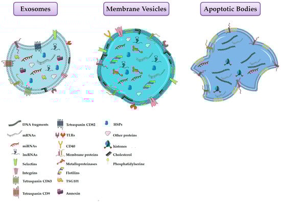 EVs consist of a heterogeneous population of vesicles surrounded by a lipid bilayer containing transmembrane proteins, DNA, RNA, and other metabolites. The lipid envelope protects bioactive molecules from extracellular enzymatic degradation. EVs were classified into exosomes, microvesicles and apoptotic bodies according to their biogenesis, surface markers, function and size (Figure 1, Table 1) [109,110]. Exosomes are derived from the multivesicular endosomal system and are secreted when the multivesicular bodies are fused with the plasma membrane. Their size is below of 50 nm in diameter and they are enriched in endosome-derived components (e.g., Alix, Tsg101) [109,111]. On the contrary, microvesicles (MVs) arise directly from the outward budding of the plasma membrane, followed by a fission event similar to the abscission step observed in cytokinesis [112]. These particles range in size between 50 nm and 1 μm [109]. MVs formation requires increased cytosolic calcium ions, molecular rearrangements within the plasma membrane in terms of lipid and protein composition (e.g., phosphatydylserine exposure), and degradation of membrane cytoskeleton [113,114,115]. Conversely, apoptotic bodies are larger than exosomes and MVs [116], and are produced by the blebbing of aging or dying cells [117,118]. However, since this last type of EVs is less studied, they will not be discussed further.
