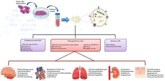 Recently, more and more in vitro and in vivo studies have demonstrated that stem cell conditioned media alone, and in particular EVs, can replicate the reparative effects observed by using stem cells (Figure 3) [156,157,158].