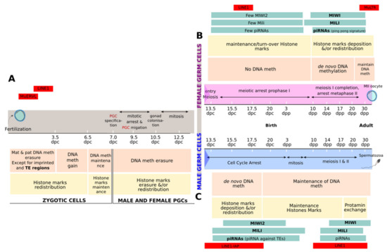 Schematic representation of transient transposable element (TE) relaxation during mouse germ cell development. From fertilization (A), maternal (mat) and paternal (pat) genomes undergo epigenetic reprogramming (DNA methylation (meth) resetting (orange) and chromatin remodeling (yellow)) that affects all genomic regions except imprinted regions and some TEs (red) until zygote implantation at 3.5 days post coïtum (dpc). After implantation, a new epigenetic landscape is established in the zygote. From 6.5 dpc, some cells of the zygote are specified as primordial germ cells (PGCs) and migrate through the genital ridge, the precursor of the gonad. A massive epigenetic reprogramming affects these PGCs until they differentiate into either the female (B, pink rectangle) or male germ line (C, blue rectangle). During germ cell differentiation, expression of numerous TEs (red rectangles) is observed and associated with the epigenetic reprogramming (DNA methylation in orange and histone modification in yellow rectangles). Actors of the piRNA pathway are differently expressed during these stages (green rectangle).