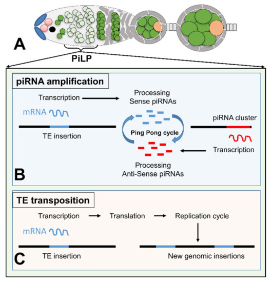 PIWI proteins have been reported to play a crucial role in germ cell specification and differentiation during early development. In Drosophila, removal of maternal PIWI affects germ cell specification by affecting the maintenance of pole plasm [87]. The existence of the Pilp is then puzzling and raises the question as to the consequences of such a piRNA pathway weakness on germline development. On both the host and TE point of view, dividing cysts are a very suitable stage for mobilizations (Figure 2). Their germline origin ensures that the new genomic insertions will be transmitted to the next generation. Whenever the mobilization is high and/or lethal for the future embryo, the mutational events will be narrowed to a cyst and the germinal stem cell will keep its potential to produce new nonmutated cysts [88]. Moreover, the production of TE transcripts may be useful to fuel the ping-pong cycle and promote piRNA amplification thanks to Aub and Ago3 that are correctly expressed in the Pilp [89]. Interestingly, this can be considered as a strategy of the host allowing TE transcription to better repress these mutagenic agents for the rest of the developing germline and future embryo (Figure 2).