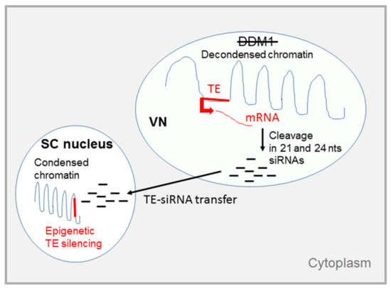 The potential role of siRNAs in the Arabidopsis male gametophyte. In the VN, the chromatin is in a decondensed state due to a lack of the chromatin remodeling protein DDM1. The transcription of TEs is allowed and gives rise to mRNAs that are cleaved in 21- and 24-nt siRNAs. These siRNAs may get out of the VN and enter the neighboring sperm cell where they direct DNA methylation of complementary TEs or genes. DNA is in blue, TEs and their mRNAs are in red. Cell-to-cell movement is indicated by an arrow.