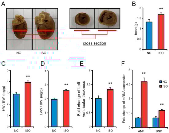 Isoproterenol induces rat cardiac hypertrophy in vivo. (A) Images of the whole hearts and cross section of Sprague Dawley (SD) rats. (B,C) Heart weight (B) and the ratio of heart weight to body weight (C) in rats. (D) The ratio of left ventricular weight to body weight. (E) Fold change of left ventricular thickness in rats. (F) Fold change of RNA expression in rats. All results are presented as the mean ± SEM. n = 6. * p < 0.05, ** p < 0.01.