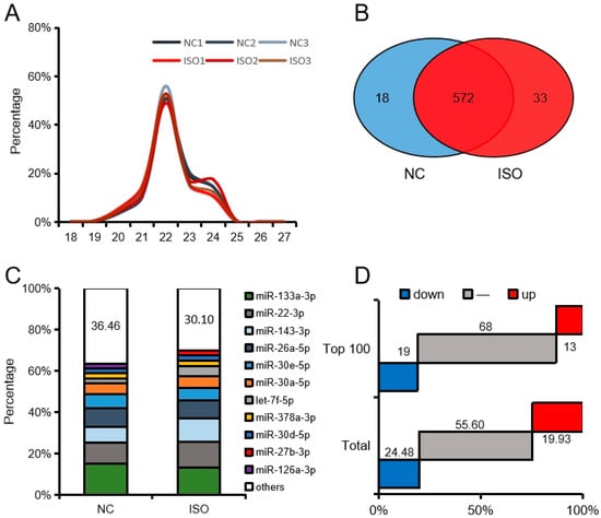 Further analysis revealed that the sequence length was between 20 and 24 nucleotides (nt), which accounted for 99.18%, and the 22 nt read had the highest abundance and accounted for 52.03% (Figure 2A). A total of 623 miRNAs were identified, and 572 were detected in both NC and ISO groups (Figure 2B). The top 10 miRNAs accounted for 63.54% in the NC group, and 69.90% in the ISO group. In addition, in the NC group and ISO group, nine miRNAs were the same among the Top 10 miRNAs (Figure 2C). We used ISO / NC as the standard (down: Fold change ≤ 2/3, up: Fold change ≥ 3/2) and found that in all miRNAs, 24.48% were up-regulated and 19.93% down-regulated. Among the top 100 miRNAs, 13 were up-regulated and 19 were down-regulated (Figure 2D).