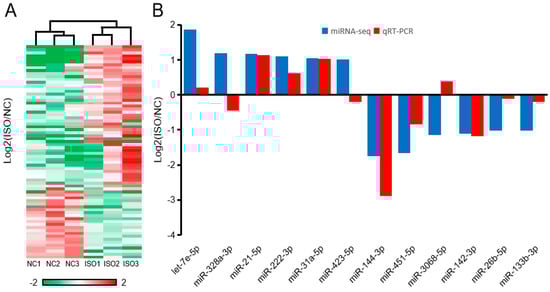 Cluster analysis of differentially expressed miRNAs showed that three samples from the NC group were clustered into one branch, while three samples from the ISO group were clustered into another branch (Figure 3A). As shown in Figure 3B, in the top 100 expression levels, six miRNAs were up-regulated (Fold change ≥ 2) and six were down-regulated (Fold change ≤ 0.5). RT-qPCR verified that from only three miRNAs (miR-328a-3p, miR423-5p, and miR-3068-5p), the expression trend did not match the sequencing results (Figure 3B).