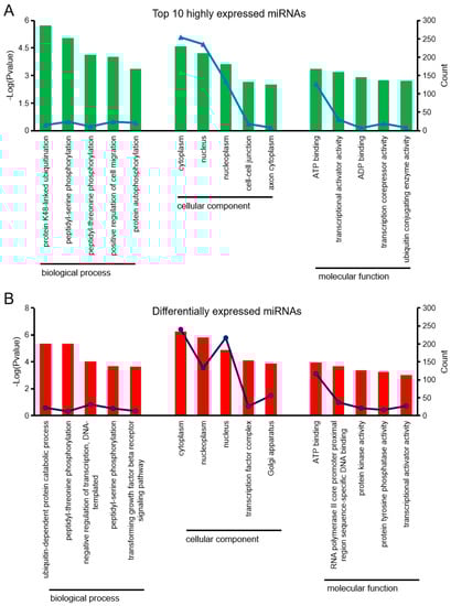 Partial gene ontology classification for predicted miRNAs. (A) Gene ontology-biological processes enrichment of target genes for top 10 highly expressed miRNAs. (B) Gene ontology–biological processes enrichment of target genes for differentially expressed miRNAs (RT-qPCR validated miRNAs).
