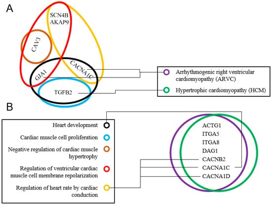 Heart-related signaling pathways. (A) Repeated genes in different heart-related biological processes in heart-related signaling pathways. (B) Repeated genes in different cardiac-related signaling pathways in cardiac-related biological processes. The same color on the left side of (A,B) represents the same signaling pathways; the same color on the right side of (A,B) represents the same biological processes.