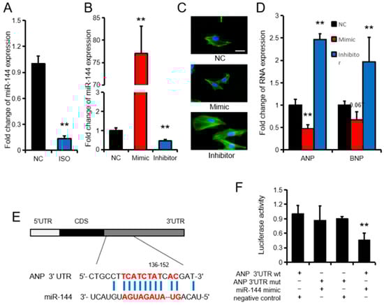 miR-144 regulates cardiac hypertrophy by targeting atrial natriuretic peptide (ANP). (A) The expression of miR-144 in rat myocardial primary cells after treatment with 10 μM isoprenaline (ISO). (B,D) Fold change of RNA expression. MiR-144 (B), ANP, and brain natriuretic peptide (BNP) (D) expression in rat myocardial primary cells after transfection with the miR-144 mimic, inhibitor, or negative control. (C) Rat myocardial primary cells were transfected for 24 h, as indicated above. Cellular F-actin and the nuclei of the cell in each group were stained with FITC-phalloidin (fluorescein isothiocyante-phalloidin) and DAPI (4′,6-diamidino-2-phenylindole). The bars of the charts indicate 25 µm. (E) Binding site of miR-144 and ANP. (F) HeLa cells were co-transfected psiCHECKTM-2 vectors and the miR-144 mimic or a negative control, and luciferase activity was determined. (B–D) are all carried out under normal conditions, without ISO treatment. Results are presented as the mean ± SEM. n = 3. * p < 0.05, ** p < 0.01.