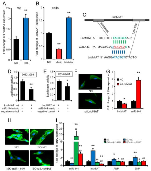 Long non-coding RNA myocardial infarction associated transcript (LncMIAT) acts as an miR-144 sponge and is involved in cardiac hypertrophy. (A,B) The expression of LncMIAT in rat myocardial primary cells after treatment with 10 μM isoprenaline (ISO) (A) or transfection with the miR-144 mimic, inhibitor, or negative control (B). (C) Binding site of miR-144 and LncMIAT. (D–E) The fluorescence intensity of the dual luciferase reporter assay. (F) Rat myocardial primary cells were transfected for 24 h, as indicated above. Cellular F-actin and the nuclei of the cell in each group were stained with FITC-phalloidin and DAPI. The bars of the charts indicate 25 µm. (B,D–F) are all carried out under normal conditions, without ISO treatment. (G) The expression of LncMIAT and miR-144 in rat myocardial primary cells after transfection with siRNA (si-LncMIAT) or the negative control (NC). (H) Rat myocardial primary cells were transfected for 24 h, as indicated above. Cellular F-actin and the nuclei of the cell in each group were stained with FITC-phalloidin and DAPI. The bars of the charts indicate 25 µm. (I) Fold change of RNA expression in rat myocardial primary cells after transfection with “negative control (NC)”, “negative control + ISO (ISO-NC)”, “miR-144 Mimic + ISO (ISO-miR-144M)”, and “si-LncMIAT + ISO (ISO-si-LncMIAT)”. All results are presented as the mean ± SEM. n = 3. * p < 0.05, ** p < 0.01, when compared to the negative control (NC). # p < 0.05, ## p < 0.01 when compared to the ISO-treated group.