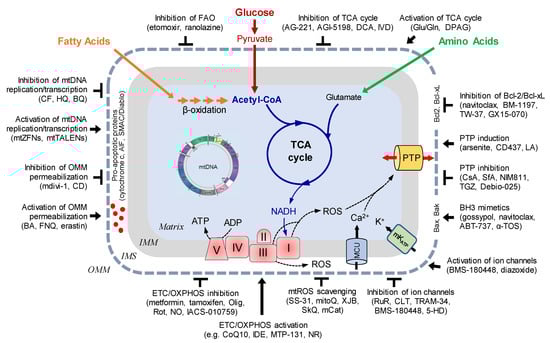 Mitochondria are promising therapeutic target for human diseases. Abbreviations: AIF, apoptosis-inducing factor; BA, betulinic acid; BQ, p-benzoquinone, mCAT, mitochondrial-targeted catalase; CD, chlorodiazepam; CF, ciprofloxacin; CLT, clotrimazole; CsA, cyclosporin A; DCA, dichloroacetate; DPAG, dipyruvyl-acetyl-glycerol; FAO, fatty acid oxidation; FNQ furanonaphthoquinone; 5-HD, 5-hydroxydecanoate; HQ, hydroquinone; Glu/Gln glutmate/glutamine; IDE, idebenone; IMM, inner mitochondrial membrane; IMS, intermembrane space; IVD, ivosidenib; mKATP, mitochondrial ATP-sensitive potassium channel; LA, lonidamine; MCU, mitochondrial calcium uniporter; NR, nicotinamide riboside; Olig, oligomycin, OMM, outer mitochondrial membrane; PTP, permeability transition pore; Rot, rotenone; RuR, ruthenium red; SfA, sanglifehrin A; mtTALENs, mitochondrially targeted transcription activator like effectors (TALE) fused with a Fok1 nuclease; α-TOS, α-tocopheryl succinate; TGZ, troglitazone; mtZFNs mitochondrially targeted zinc finger nucleases. The names of representative compounds are shown in brackets.