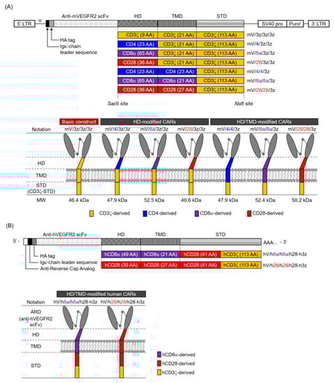 Illustration of vascular endothelial growth factor receptor 2 (VEGFR2)-specific chimeric antigen receptors (CARs) with hinge domain (HD) or hinge/transmembrane domains (HD/TMD) modification. (A) Top panel, retroviral vector constructs containing the murine VEGFR2-specific first-generation CAR genes for mouse T cells; lower panel, representation of HD-modified or HD/TMD-modified CAR proteins. The figure shows the number of amino acids (AA) used to generate HD/TMD/signal-transduction-domain (STD) and the molecular weight (MW) of each CAR. (B) Top panel, human VEGFR2-specific second-generation CAR mRNA constructs for human T cells; lower panel, representation of HD/TMD-modified CAR proteins. (C) AA sequences of CD3ζ, CD4, CD8α, and CD28 used for constructing the HD/TMD in this study. Cysteines that form interchain disulfide bonds are shown in bold and glycosylation sites are shown in bold italic. For CD8α-HD/TMD and CD28-HD/TMD, sequence alignment between mouse and human is shown. An asterisk denotes an identical AA, whereas alignment gaps are indicated by a hyphen. In CD28-HD, the area that forms the β-sheet structure is underlined.