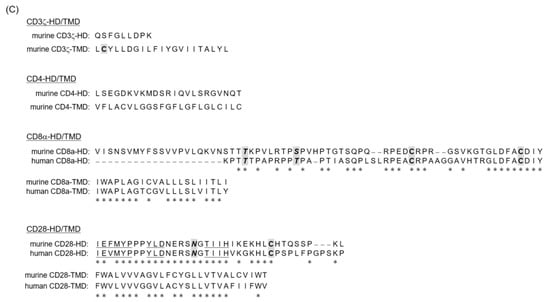 CAR oligomerization will also be a factor in changing the efficiency and quantity of CD3ζ-STD signaling. CD3ζ, CD8α, and CD28 used for the CAR HD/TMD in this study are originally present on T cells as dimers, and only CD4 is expressed as a monomer. Cysteine residues responsible for oligomerization are present in CD3ζ-TMD [13], CD8α-HD [17], and CD28-HD [18] (Figure 1C), which presumably contribute to CAR oligomerization. Furthermore, previous studies using human T-cell leukemia cell lines (Jurkat cells) have reported that CARs with CD3ζ-TMD form heterodimers with endogenous CD3ζ and the presence of this complex enhances the functionality of CAR-expressing Jurkat cells [37]. Here, too, some CARs (mV/3z/3z/3z and mV/4/3z/3z) with CD3ζ-TMD had a size of approximately 60 kDa and are assumed to be heterodimers of CAR (46–48 kDa) and endogenous CD3ζ (15 kDa). Therefore, it is highly likely that CAR and endogenous molecules form a complex in primary T cells. On the other hand, cysteine residues in HD/TMD are also anticipated to form unexpected complexes with membrane proteins different from its original molecule or same CAR molecule, as detected in multiple bands in western blot analysis. Depending on the type and size of such membrane proteins, an unexpected signal may be transduced together with the CAR signal, or the antigen-binding properties of CAR may be lost due to steric hindrance. Therefore, identifying the components of the CAR complex using mass spectrometry and the functional analysis of CAR with mutants of amino acids involved in post-translational modification remains an important future task.