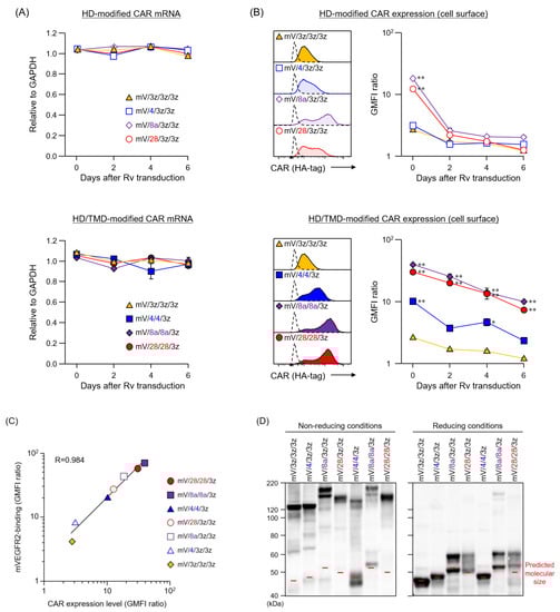 Since CAR HD/TMD are assumed to regulate CAR expression level, we hypothesized that differences in HD/TMD would affect the amount of CAR signal input to T cells. In this study, we aimed to reveal the role of HD/TMD in CAR activity and CAR-T cell function using a first-generation CAR that inputs only a CD3ζ signal, rather than a second-generation CAR that inputs the CD3ζ signal and the co-stimulatory signal that modulates it. We constructed a basic CAR (mV/3z/3z/3z), in which CD3ζ-derived HD/TMD/STD was linked to anti-mVEGFR2 scFv, and HD-modified and HD/TMD-modified CARs that replaced HD and HD/TMD of mV/3z/3z/3z with the corresponding regions of CD4, CD8α, and CD28 that are constitutively expressed on T cells (Figure 1A). Our previous work established a stable and highly efficient CAR gene T cell transduction protocol for analyzing CAR structure–activity relationships [15]. In the CAR-T cells generated in this study, CAR mRNA levels of all CAR variants were comparable to those of mV/3z/3z/3z, and were constant for at least six days after Rv transduction (Figure 2A). Therefore, HD or HD/TMD modification did not affect transcription from the CAR gene. In contrast, these CAR expression levels on T cells differed substantially (Figure 2B). Whereas replacement of mV/3z/3z/3z with CD4-HD did not change its surface expression level, replacement with CD8α-HD or CD28-HD caused CAR expression level to increase significantly immediately after Rv transduction (day 0), but then returned to mV/3z/3z/3z levels two days later. CAR expression level was enhanced much more in HD/TMD-modified than in HD-modified CARs, and decreased in the following order: mV/8a/8a/3z > mV/28/28/3z > mV/4/4/3z. Unlike HD-modified CARs, HD/TMD-modified CARs only gradually disappeared from the T cell membrane, with mV/8a/8a/3z and mV/28/28/3z exhibiting significantly higher surface expression levels than mV/3z/3z/3z, even six days after Rv transduction. Furthermore, the mVEGFR2-binding of these CARs correlated with CAR expression level, confirming that HD/TMD changes do not affect the mVEGFR2-recognition properties of the ARD (Figure 2C).