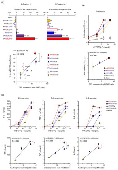 Functional characteristics of mouse T cells expressing CARs with different hinge domain (HD) and transmembrane domain (TMD). (A) Top panel, cytotoxic activity of HD-modified and HD/TMD-modified CAR-T cells four days after Rv transduction against mVEGFR2+ EL4 cells; lower panel, relationship between cytotoxicity at E/T ratio = 20 and CAR expression level. (B) Top panel, proliferation activity of HD/TMD-modified CAR-T cells following mVEGFR2-stimulation; lower panel, relationship between proliferation activity upon stimulation with mVEGFR2-Fc 20 ng/mL and CAR expression level. (C) Top panel, cytokine-producing ability of the above cells: interferon-γ, tumor necrosis factor-α, and interleukin-2; lower panel, relationship between cytokine-producing ability upon stimulation with mVEGFR2-Fc 200 or 2000 ng/mL and CAR expression level. The data are representative of at least two independent tests. Statistical analysis was performed using Dunnett’s test against mV/3z/3z/3z; * p < 0.05, ** p < 0.01; or Student’s t-test; † p < 0.05, †† p < 0.01.