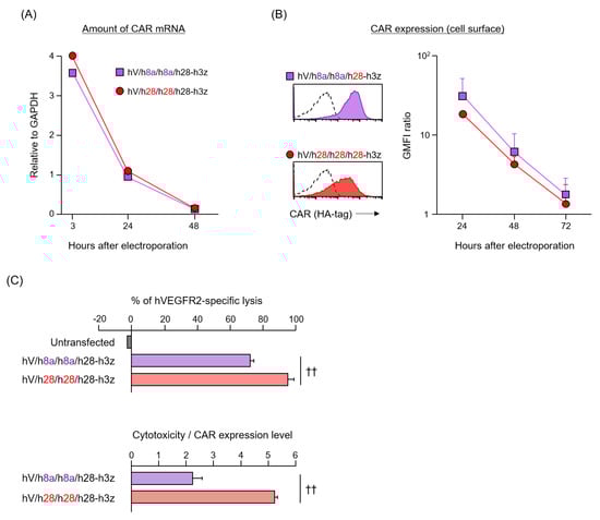 Given that the AA sequences of mouse and human immune molecules do not match completely, it is important to determine whether HD/TMD characteristics of mouse CAR can be extrapolated to human CAR. CD8α-HD/TMD shares 62.8% AA identity between mice and humans, whereas CD28-HD/TMD shares 66.8% AA identity (Figure 1C). We constructed two human second-generation CARs (hV/h8a/h8a/h28-h3z and hV/h28/h28/h28-h3z) with hCD8α-HD/TMD or hCD28-HD/TMD for clinical use (Figure 1B), and examined whether the structure–activity relationship of human CAR was similar to that of mouse CAR. Two kinds of human CAR-T cells were prepared by CAR mRNA electroporation [12]. Introduction efficiency and disappearance of CAR mRNA were equivalent between the two types (Figure 4A). Surface expression of CAR translated from mRNA was slightly, albeit not significantly, higher in hV/h8a/h8a/h28-h3z than in hV/h28/h28/h28-h3z (Figure 4B). As CAR mRNA disappeared, both CARs vanished from the T cell membrane with a half-life of approximately 12 h. These results confirm that each CAR with hCD8α- or hCD28-HD/TMD shows equivalent efficiency and sustainability of surface expression even in human T cells, despite a different production method from mouse CAR-T cells. Finally, the antigen-specific cytotoxic activity of human CAR-T cells was evaluated 24 h after electroporation. CAR [hV/h28/h28/h28-h3z]-T cells showed significantly higher cytotoxic activity than CAR [hV/h8a/h8a/h28-h3z]-T cells, and its cytotoxicity per CAR expression level was about 2.5 times higher (Figure 4C). Therefore, in both human and mouse CAR-T cells, HD/TMD modification affects the CAR surface expression level as well as CAR activity.