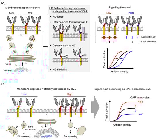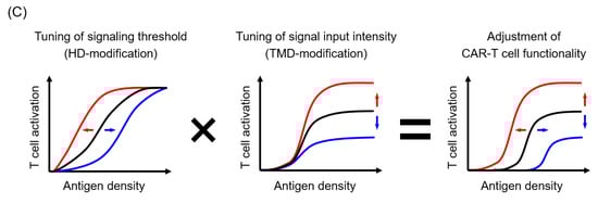 CAR HD and TMD affected the amount of CAR signaling in T cells via the regulation of the CAR avidity and activity. HD played a role in the control of the modality of CAR expression and membrane transport efficiency of CAR, and the definition of the CAR signaling threshold (Figure 5A). TMD played a role in the regulation of the amount of CAR signaling into T cells via the control of the CAR surface expression level (Figure 5B). By performing CAR structure–activity relationship analysis focusing on HD/TMD, it will be possible to adjust the functional strength and the response to antigen density of CAR-T cells, while retaining the antigen specificity of the ARD and the signal characteristics of the STD (Figure 5C).
