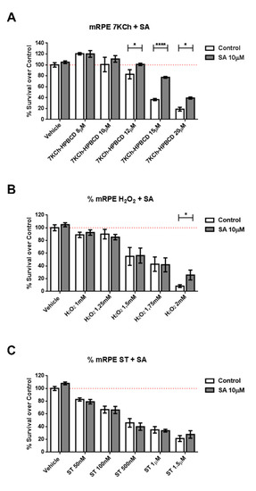 Protective effect of SA in different cell death models in mRPE retina cells. Cell survival in mRPE cell cultures was measured by the MTS method. (A) Protective effect over dose-dependent 7KCh-HPBCD cell death. (B) Protective effect over dose-dependent H2O2 oxidative stress injury. (C) Protective effect over dose-dependent caspase-3 dependent staurosporine cell death. Data are presented as mean ± SEM of 12-well plates of at least four different experiments. * p < 0.05, **** p < 0.0001. Red dashed line is a guidance mark of 100% of viability in control cells.