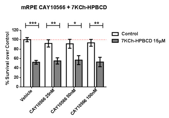 SCD1-inhibitor CAY10566 does not protect against the 7KCh-induced cell death in mRPE cells. Different CAY10566 doses were tested to restore cell viability against the 15 μM 7KCh-HPBCD cytotoxicity. Data represented mean ± SEM of 12-well plates of at least four different experiments. * p < 0.05, ** p < 0.01, *** p < 0.001. The red dashed line is a guidance mark of 100% of viability of control cells treated with vehicle only. White bars correspond to cells treated only with CAY10556 (0–100 nM), while grey bars correspond to cells treated with 7KCh-HPBCD 15 µM and CAY10556 (0–100 nM).