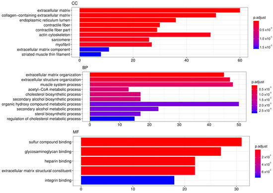 TOP GO categories for biological process, cellular component and molecular function in gene expression modified by SA. Gene ontology (GO) enrichment analysis was performed with DEGs induced by SA administration for 24 h to mRPE cells. The annotated DEGs were classified into the cellular component, molecular function and biological process categories by EnrichGO according to the GO terms. The y-axis shows the functional groups while the x-axis shows the number of genes in each category.