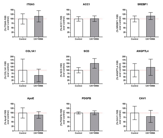 Gene expression in mRPE cells after 100 nM CAY10566 treatment for 24 h. A broad panel of genes related to cell adhesion, extracellular matrix, lipid synthesis and metabolism and cell signaling was checked. Data represent mean ± SEM gene expression with respect to the 18S-housekeeping gene of three different experiments. The Wilcoxon non-parametric test was used to evaluate related samples. The red dashed line is a guidance mark for 100% expression in control cells.