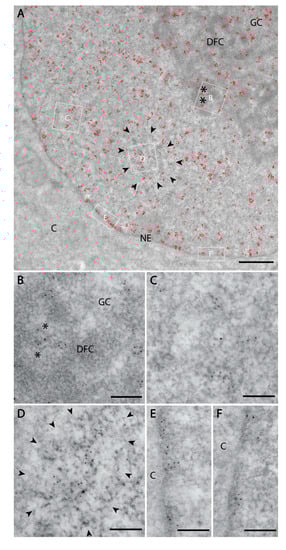Nuclear PI(4)P localisation according to transmission electron microscopy. Electron microscopy revealed the localisation of PI(4)P: (A) to the cell nucleus (red dots). Black asterisk—fibrillar centre; DFC—dense fibrillar component; GC—granular component; NE—nuclear envelope; C—cytoplasm; black arrowheads delineate nuclear speckles. (B) In the nucleolus, PI(4)P is enriched in the DFC and also GC, but it does not localise to the FC. (C) In the nucleoplasm, PI(4)P is enriched on chromatin. (D) PI(4)P is also enriched at the nuclear speckles, and nuclear envelope (E,F) where it localises to nuclear lamina. (B–F) are high magnification insets from the same cell.