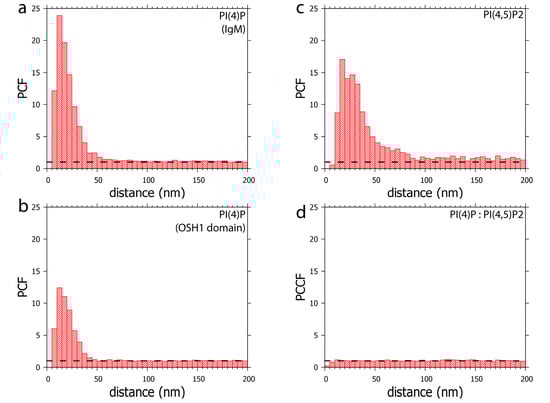 Clustering patterns of (a) PI(4)P labelled with anti-PI(4)P antibody or (b) PI(4)P labelled with OSH1-PH domain. The foci formed by PI(4)P are up to 50 nm in size. (c) Clustering pattern of PI(4,5)P2 labelled with anti-PI(4,5)P2 antibody. The foci formed by PI(4,5)P2 are up to 100 nm in size (d) Co-localisation analysis of PI(4,5)P2 with OSH1-PH labelling (Figure 4). PI(4)P does not specifically co-localise with PI(4,5)P2. PCF—pair correlation function, PCCF—pair cross-correlation function. Dashed lines mark the value of functions equal to 1, which corresponds to a random distribution.