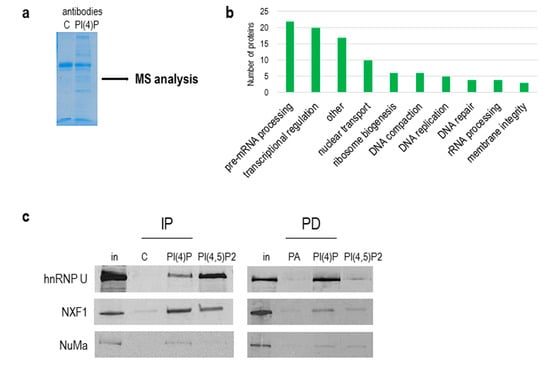 PI(4)P forms lipid–protein complexes in the nucleus. (a) PI(4)P-binding partners were immunoprecipitated with anti-PI(4)P antibody, and the gel was stained with Coomassie Blue; MS—mass spectrometry. (b) The graph shows a number of proteins identified by mass spectrometry, divided into different sub-groups based on their function in the nucleus (uniprot.org). (c) Example of proteins immunoprecipitated with anti-PI(4)P and anti-PI(4,5)P2 antibody (IP) and pulled down with PI(4)P/PI(4,5)P2-coated agarose beads (PD). Ten percent of an input nuclear lysate was loaded on the gel in rows “in”. In—input; C—control mouse IgM antibody; PA—phosphatidic acid-coated agarose beads; hnRNP U—heterogeneous nuclear ribonucleoprotein U; NXF1—nuclear RNA export factor 1; NuMa—nuclear mitotic apparatus protein 1.