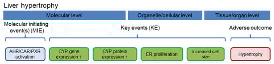 Nuclear receptor activation occurs as molecular initiating events of the pathway(s) leading to different adverse effects in the liver. For two important hepatic outcomes frequently observed after exposure to azole fungicides, i.e., hepatocellular hypertrophy and fatty changes/steatosis, schematic drawings of adverse outcome pathways (AOPs) are presented in Figure 2 and Figure 3, respectively.
