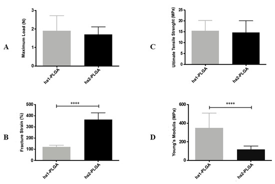 Mechanical characteristics of ha1- and ha2-PLGA fleeces. (A) Maximum Load (N); (B) Fracture Strain (%); (C) Ultimate Tensile Strength (MPa); (D) Young’s Modulus (MPa) carried out on ha1-PLGA and ha2-PLGA fleeces (n = 5 for each type of fleece, fleece dimension: 50 mm × 15 mm). Electrospun ha2-PLGA fleeces possess higher Fracture Strain values compared to those for ha1-PLGA, whereas ha1-PLGA fleeces possess higher Young’s Modulus values compared to those for ha2-PLGA. **** Statistically significant values between ha1-PLGA and ha2-PLGA fleeces (p < 0.0001).
