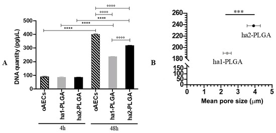 DNA concentrations obtained from 0.05 × 106 oAECs before seeding and after seeding onto both PLGA fleeces or on Petri dishes at 4 h and 48 h culture were quantified. The results clearly show that DNA concentration from oAECs before seeding corresponds to 91.66 ± 3.33 pg/µL (data not shown) and was comparable to those obtained after 4 h of cell seeding on Petri dish (90.94 ± 2.34 pg/µL; p > 0.05) and onto PLGA fleeces under static conditions (87.54 ± 1.75 pg/µL for ha1-PLGA vs. 86.52 ± 1.55 for ha2-PLGA; p > 0.05). These results confirm a high seeding efficiency onto both surfaces of PLGA fleeces and show also that the same number of cells adhered to fleeces independently to the fiber diameter size. Moreover, oAECs cultivated on Petri dish after 48 h showed a high DNA concentration (oAECs 48 h: 402.86 ± 1.06 pg/μL), whereas cells cultured on both types of fleeces proliferated less at this time period showing a significant decrease in DNA concentration (ha1-PLGA: 238 ± 1.67 pg/μL and ha2-PLGA: 320.46 ± 1.17 pg/μL, respectively, p < 0.05 vs. oAECs 48 h; Figure 5A). However, DNA quantity was higher in both fleeces after 48 h of culture compared to those detected after 4 h (p < 0.05; Figure 5A). In addition, DNA concentration was significantly higher in oAECs seeded on ha2-PLGA (320.46 ± 1.17 pg/μL) compared to those observed on ha1-PLGA (238 ± 1.67 pg/μL: p < 0.05; Figure 5A). By comparing DNA quantity and pore size (Figure 5B) it is evident that cell proliferation is highly dependent on pore size (p < 0.0001).