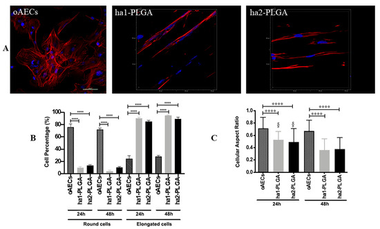 The percentage of elongated cells was then calculated after 24 and 48 h culture onto both types on ha-PLGA fleeces. After just 24 h culture, the percentage of oAECs with an elongated morphology was similar in both ha1-PLGA and ha2-PLGA fleeces (p > 0.05) but significantly higher with respect to cells on Petri dishes used as control (p < 0.0001) (90%, 85%, and 24%, respectively; Figure 7B). The number of elongated cells increased after 48 h of culture up to 95% and 89% in ha1-PLGA and in ha2-PLGA fleeces, respectively (p > 0.05) demonstrating that fiber alignment was able to transform oAECs from a cuboidal phenotype to an elongated morphology. Moreover, the cell nuclei aspect ratio, representing the ratio between nuclei width and its length, demonstrated that the cell nuclei onto both PLGA fleeces become more elongated after 48 h culture compared to 24 h culture (p < 0.0001; Figure 6C). This ratio was higher in oAECs seeded on Petri dishes, used as a control, (0.71 ± 0.18) confirming the ovoidal shape nuclei (i.e., 1 is perfectly circular) compared to the ratios obtained with the cells seeded onto both electrospun PLGA fibers relative to after 24 h that were significantly lower (0.53 ± 0.14 for ha1-PLGA and 0.49 ± 0.22 for ha2-PLGA with respect to 0.71 ± 0.18 for oAECs; p < 0.0001). Additionally, the cellular aspect ratio decreased further after 48 h culture in the cells seeded onto ha1-PLGA (0.36 ± 0.18) and ha2-PLGA (0.37 ± 0.19) with respect to 0.67 ± 0.17 for oAECs (p < 0.0001). However, by comparing the cellular aspect ratios of the cells seeded onto the two PLGA fleeces types, it was possible to verify a significant decrease in this ratio between the two culture time points (0.53 ± 0.14 vs. 0.36 ± 0.18 for ha1-PLGA and 0.49 ± 0.22 vs. 0.37 ± 0.17 for ha2-PLGA, p < 0.0001) demonstrating that increasing the cell culture time onto both types of ha-PLGA fleeces lead to a further elongation in cell morphology.