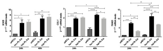To better understand in depth oAECs tenogenic differentiation, it was analyzed the gene expression profile of three tendon-related genes: SCX (early tenogenic marker), COL1 and TNMD (mature tendon markers). In particular, SCX and COL1 gene expression were significantly up-regulated in oAECs seeded onto both ha-PLGA fleeces with respect to oAECs after 24 h culture (p < 0.05; Figure 9). TNMD gene expression was significantly higher after 24 h culture with respect to oAECs in cells cultured onto both ha-PLGA fleeces, even if the significantly higher expression was noticed in ha1-PLGA with respect to ha2-PLGA (p < 0.001 for ha1-PLGA and p < 0.05 for ha2-PLGA). Moreover, it increased significantly with respect to oAECs in both types of ha-PLGA fleeces after 48 h culture (p < 0.0001 for ha1-PLGA and p < 0.001 for ha2-PLGA; Figure 9). After 24 h culture, SCX and COL1 mRNA gene expression were similarly up-regulated in ha1- and ha2-PLGA fleeces (p > 0.05; Figure 9), whereas TNMD mRNA gene expression was differently expressed in ha1-PLGA vs. ha2-PLGA (p < 0.01). All tendon-related gene expression significantly increased after 48 h (p < 0.01; Figure 9). In detail, SCX was more upregulated in ha2-PLGA fleeces with respect to ha1-PLGA (p > 0.05), while conversely COL1 and TNMD were significantly more upregulated in ha1-PLGA fleeces with respect to ha2-PLGA (p < 0.05 and p < 0.01 for COL1 and TNMD mRNA gene expression, respectively; Figure 9).