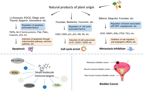 This review summarizes the promising natural products derived from plants and discusses their anti-bladder cancer mechanisms, including inducing apoptosis, regulating the cell cycle, and anti-metastasis properties (Figure 1). Furthermore, this review includes the discovery of novel small molecules to target immune targets for bladder cancer treatment from products of plant origin in the hope that this might pave the way for new ideas in the fields of oncology, immunology, phytochemistry, and cell biology utilizing natural products of plant origin as promising drugs for bladder cancer treatment.