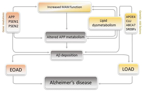 Gene mutations and genetic risk factors linked to lipid dysmetabolism and the progression of Alzheimer’s disease (AD). Gene mutations responsible for inherited early-onset AD cases (EOAD, gene mutations) and genetic risk factors for late-onset AD cases (LOAD, genetic risk factors) lead to altered amyloid precursor protein (APP) processing and brain amyloid-β (Aβ) deposition. Disruption of lipid homeostasis induces abnormal lipid composition in rafts and increased mitochondria-associated endoplasmic reticulum membrane (MAM) function in which targeted APP is proteolytically processed into Aβ by presenilins (PSEN). Conversely, cleavage of APP directly affects cellular lipid composition by altering the synthesis of several lipids that are enriched in lipid rafts. Abbreviations: APOE4 (Apolipoprotein E4); CLU (Clusterin); ABCA7 (ATP-binding cassette sub-family A member 7); SREBFs (Sterol regulatory element-binding genes).