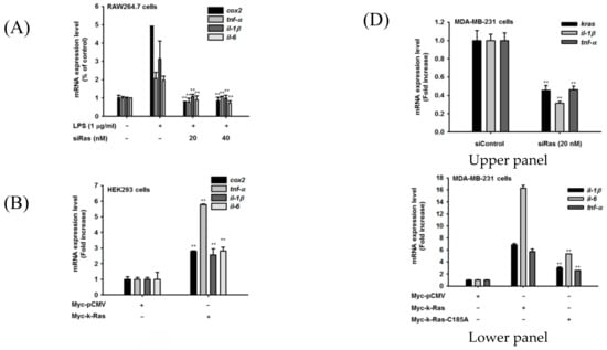 Since previous results indicate that ICMT could play a critical role in TLR-mediated inflammatory responses, we next tried to understand the mechanistic basis of this effect. For this, we focused on Ras, a well-known substrate of ICMT that is post-translationally modified by methylation in isoprenylated cysteine (Cys-185) [47], which was increased under the same conditions in vitro and in vivo (Figure 1). First, to confirm that LPS-activated Ras plays a critical role in ICMT-mediated inflammatory responses during TLR activation, we treated siRNA targeting K-RAS (siRas) to LPS-activated RAW264.7 cells. As Figure 3A shows, siRas treatment completely suppressed the expressions of COX-2, TNF-α, IL-1β, and IL-6. In contrast, RAS-overexpressing HEK293 cells also displayed increased levels of COX-2, TNF-α, IL-1β, and IL-6 from 3- to 6-fold (Figure 3B). Interestingly, suppression of Ras methylation by overexpression of unmethylated Ras mutant (RAS-C185A, Figure S4) displayed weak expressions of those inflammatory genes (Figure 3C). In addition, we also examined whether Ras is able to control inflammatory responses in cancer cells. For this, we employed MDA-MB-231 breast cancer cells and assessed the levels of inflammatory genes under siRas treatment or Ras overexpression conditions. As seen in macrophages and HEK293 cells (Figure 3A–C), knockdown of RAS clearly suppressed the levels of IL-1β and TNF-α in breast tumor cells (Figure 3D, upper panel). In contrast, overexpression of RAS enhanced the expression levels of IL-1β, IL-6, and TNF-α, while the induction effect of unmethylated Ras was significantly reduced compared to wild type (Figure 3D, lower panel).