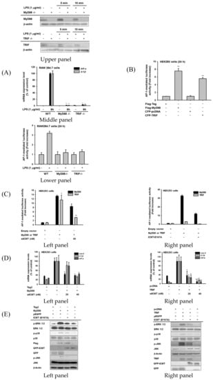 ICMT/Ras expression is both MyD88- and TRIF-dependent. ((A), upper panel) Protein levels of MyD88 and TRIF in RAW264.7 cells under their knockout conditions in the presence or absence of LPS (1 µg/mL). (A, middle panel) Inhibitory effects of MyD88 and TRIF knockout on the expression of inflammatory genes (TNF-α and IL-1β) in RAW264.7 cells stimulated with LPS (1 µg/mL). ((A), lower panel, (B,D)) AP-1-mediated luciferase activity was analyzed by reporter gene assay in MyD88- and TRIF-knockout RAW264.7 cells ((A), lower panel), HEK293 cells transfected with Flag-MyD88 or CFP-TRIF (B), or HEK293 cells transfected with Flag-MyD88 or CFP-TRIF in the presence or absence of siICMT or ICMT-E167A ((C), left and right panels). Luminescence levels were determined with a luminometer. (D) mRNA expression levels of COX-2, TNF-α, and IL-1β were determined using real-time PCR in HEK293 cells transfected with MyD88 ((D), left panel) or TRIF ((D), right panel). (E) Total and phospho-protein levels of MAPK in HEK293 cells during transfection with MyD88, TRIF, and the dominant negative form of ICMT (ICMT-E167A). (F) Total and phospho-protein levels of ERK1/2 and their upstream enzymes (MEK1/2, c-Raf, and IRAK4) in HEK293 cells transfected with MyD88 or TRIF in the presence or absence of siRas were analyzed using immunoblotting analysis.