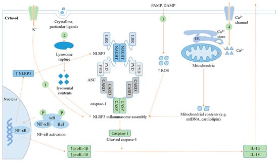 Models for nucleotide-binding domain, leucine-rich-repeat-containing family, pyrin domain-containing 3 (NLRP3) inflammasome activation. Four models for NLRP3 inflammasome activation that may not be exclusive have been proposed: (1) Multiple signal transduction pathways triggered by pathogen-associated molecular patterns (PAMPs)(/danger-associated molecular patterns DAMPs) converge on K+ efflux [20,21,22], leading to NLRP3–NEK (NIMA related kinase) interaction and NLRP3 inflammasome activation [23,24]. (2) Engulfment of crystalline or particular ligands, including monosodium urate (MSU) [25], silica [26], and amyloid-β [27], leads to lysosomal damage and resultant cytosolic release of lysosomal contents, which activates the NLRP3 inflammasome. (3) NLRP3 agonists, including ATP [28], MSU, and asbestos [29] trigger production of reactive oxygen species (ROS). This common pathway engages the NLRP3 inflammasome. However, later studies demonstrated that ROS only control NLRP3 inflammasome activation in the priming step, but not in the activation step [30]. ROS generation is even dispensable for both the priming and activation in certain circumstances [20]. (4) Ca2+ mobilization from extracellular milieu or endoplasmic reticulum (ER) Ca2+ stores induced by NLRP3 agonists leads to elevation of cytosolic Ca2+ concentration. Excessive and/or sustained mitochondrial Ca2+ influx results in Ca2+ overload, mitochondrial damage, and release of mitochondrial contents, triggering NLRP3 inflammasome activation [31,32,33].