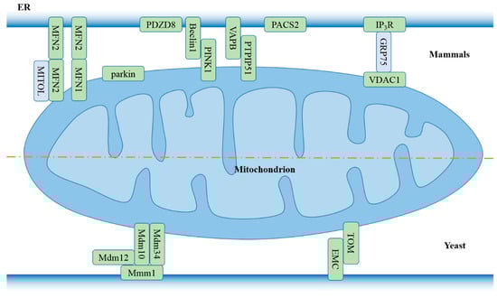 Structural components of mitochondria-associated ER membranes (MAMs). In mammalian cells, ER MFN2 tethers the ER to mitochondria by participating in homotypic or heterotypic interaction with mitochondrial MFN1 and MFN2 [44]. Mitochondrial ubiquitin ligase MITOL (also called MARCH5) interacts with and ubiquitinates mitochondrial MFN2, but not ER MFN2, to regulate MAM formation [45]. Parkin, through its N-terminal ubiquitin-like domain [46] and PDZD8 [47] engages in MAM formation, and favors Ca2+ transfer from the ER to mitochondria. The ER–mitochondria tethering complex, including PINK1/Beclin1 [48] and VAPB/PTPIP51 [49], enhances formation of ER–mitochondria contact sites and autophagosome. PACS2 participates in maintaining the ER–mitochondria axis [50]. In the yeast Saccharomyces cerevisiae, two tethering complexes are identified—Mmm1/Mdm10/Mdm12/Mdm34 complex (also known as ERMES complex) [51,52] and EMC/TOM [53]. Abbreviations: MFN2, mitofusin 2; PDZD8, PDZ domain containing 8; PINK1, PTEN induced putative kinase 1; VAPB, vesicle-associated membrane protein-associated protein B; PTPIP51, protein tyrosine phosphatase interacting protein 51; PACS2, phosphofurin acidic cluster protein 2; Mmm1, maintenance of mitochondrial morphology protein 1, Mdm10, mitochondrial distribution and morphology protein 10; ERMES, ER–mitochondria encounter structure; EMC, ER membrane protein complex; TOM, translocase of the outer membrane.