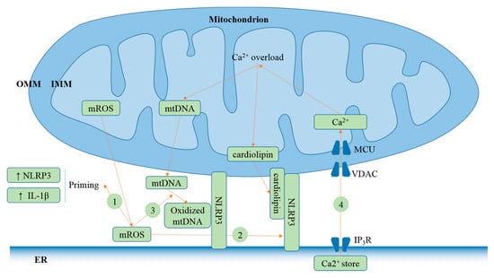 MAMs contribute to NLRP3 inflammasome activation. (1) ER–mitochondria proximity plays a crucial role in the signaling pathways associated with short-lived ROS. Its generation induces increased expression of NLRP3 and substrate of the inflammasome IL-1β [30]. NLRP3 level is critical for the priming step. The inflammasome can be activated by ATP alone without lipopolysaccharide (LPS) priming in macrophages overexpressing NLRP3 [74]. (2) mROS promote NLRP3 association with mitochondria [73], which subsequently induces its interaction with cardiolipin that translocates from the inner mitochondrial membrane (IMM) to the outer mitochondrial membrane (OMM) in response to the NLRP3 stimuli [72]. (3) mROS mediate oxidation of mtDNA [75]. Oxidized mtDNA binds to NLRP3, triggering NLRP3 inflammasome activation [7]. (4) The close proximity between the ER and mitochondria facilitates rapid Ca2+ mobilization to mitochondria from the ER through mitochondrial calcium uniporter (MCU) and voltage-dependent anion-selective channel (VDAC), leading to mitochondrial Ca2+ overload, mitochondrial dysfunction, release of mtDNA and cardiolipin externalization [31,33,76].