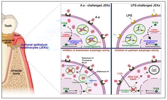 Vicencio, E.; Cordero, E.M.; Cortés, B.I.; Palominos, S.; Parra, P.; Mella, T.; Henrríquez, C.; Salazar, N.; Monasterio, G.; Cafferata, E.A.; et al. Aggregatibacter actinomycetemcomitans Induces Autophagy in Human Junctional Epithelium Keratinocytes. Cells 2020, 9, 1221. https://doi.org/10.3390/cells9051221