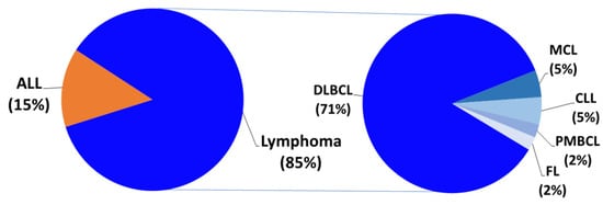 Of the 41 patients included in this study, 29 were male and 12 were female. A total of 35 patients (85%) were diagnosed with lymphoma and six patients (15%) with ALL. Of all lymphoma patients, 29 patients (71%) had DLBCL, two (5%) had MCL, two (5%) had CLL, one (2%) had FL, and one (2%) had PMBCL. Figure 1 shows the distribution of the disease entities of the patients included in this study.