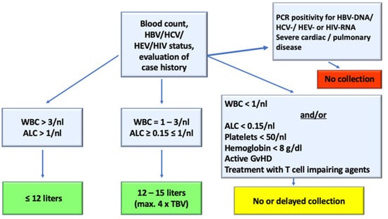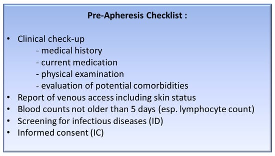 Patients with progressing disease receive a bridging therapy and therefore are often in a leukopenic situation or suffer from other disease- and/or treatment-related complications. Nevertheless, even in this patient population leukapheresis is safe and frequently results in the collection of sufficient numbers of CD3+ lymphocytes for the manufacture of CAR-T cells [33,34]. One single hospitalization was necessary due to hypercalcemia in the course of disease progression. The aim is to standardize the pre-leukapheresis check-up and the cell collection via leukapheresis to prevent possible collection failures or loss of time. Figure 3 shows an algorithm addressing the clinical check-up, blood values, and infectious disease markers with the respective criteria leading to a cancellation or delayed collection.