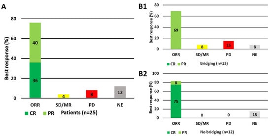 Best response (%) in patients receiving leukapheresis for axicabtagen ciloleucel. A total of 25 patients, all receiving leukapheresis for axicabtagene ciloleucel, were investigated for response (CR = complete response, PR = partial response, SD/MR = stable disease/mixed response, PD = progressive disease, NE = not evaluable). In 12% of patients, no remission data was available, either due to death of progressive disease prior to staging or not yet processed staging CT scans. (A) = all patients, (B) = patients requiring bridging (B1, upper panel) vs. patients requiring no bridging (B2, lower panel).