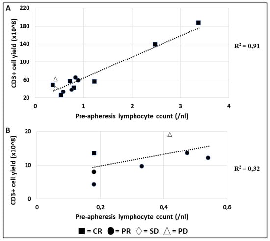 Overview pre-leukapheresis lymphocyte count and CD3+ cell yield by response (axicabtagen ciloleucel). In this figure, pre-apheresis data on lymphocyte count and CD3+ cell yield by response are shown. Group (A) displays a CD3+ cell yield of >20 (×108), ((B) group ≤ 20 (×108)). Splitting of this figure in two panel groups was done for improved graphic display.
