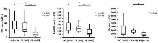 Due to the frequently low leukocyte and lymphocyte count at the time of leukapheresis, the lymphocyte count prior to apheresis and CD3+ T cell yield in the product were matched to the remission outcome (Figure 5). A total of 80% of patients with lymphocyte counts below 0.6/nL in the peripheral blood and subsequent CD3+ T cell yield below 20 ×108 in the apheresis product achieved at least a partial remission after CAR-T cell infusion. Thus, it can be concluded that even in patients with low lymphocyte counts leukapheresis is feasible and collected T cells can be transformed into a functional CAR-T cell product. In addition, in a comparison of leukapheresis products from 21 patients receiving axicabtagene ciloleucel, patients with leukapheresis products containing more than 70 × 108 CD3+ T cells and 205 × 108 TNCs reached a complete remission. Additionally, patients achieving complete remission had significantly higher CD3+ T cell and TNC counts than patients with partial remission (see Section 3.8). In contrast, CD3+ T cell and TNC counts of these patients with CR were comparable to leukapheresis products of healthy donors (Figure 6). This interesting finding however is based on a small sample size of only 25 patients evaluated for remission and should be further evaluated in clinical practice with regard to autologous or off the shelf CAR-T cell production.